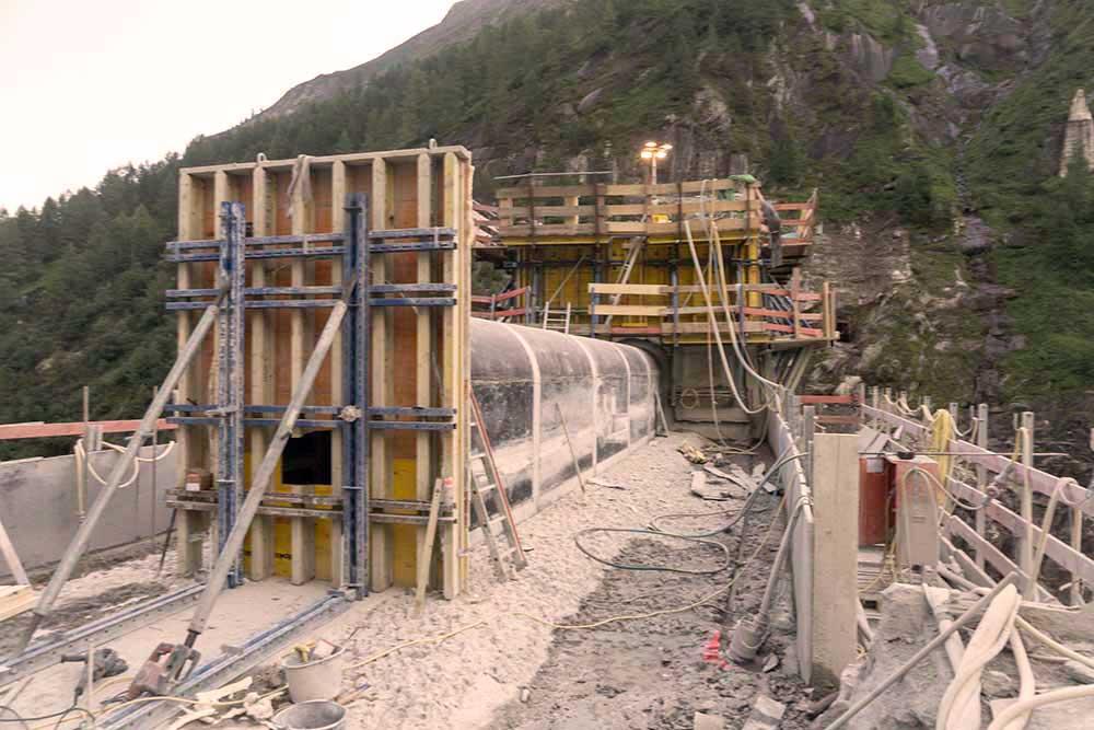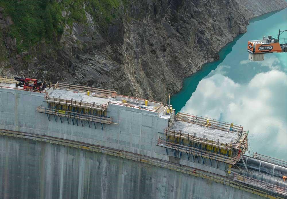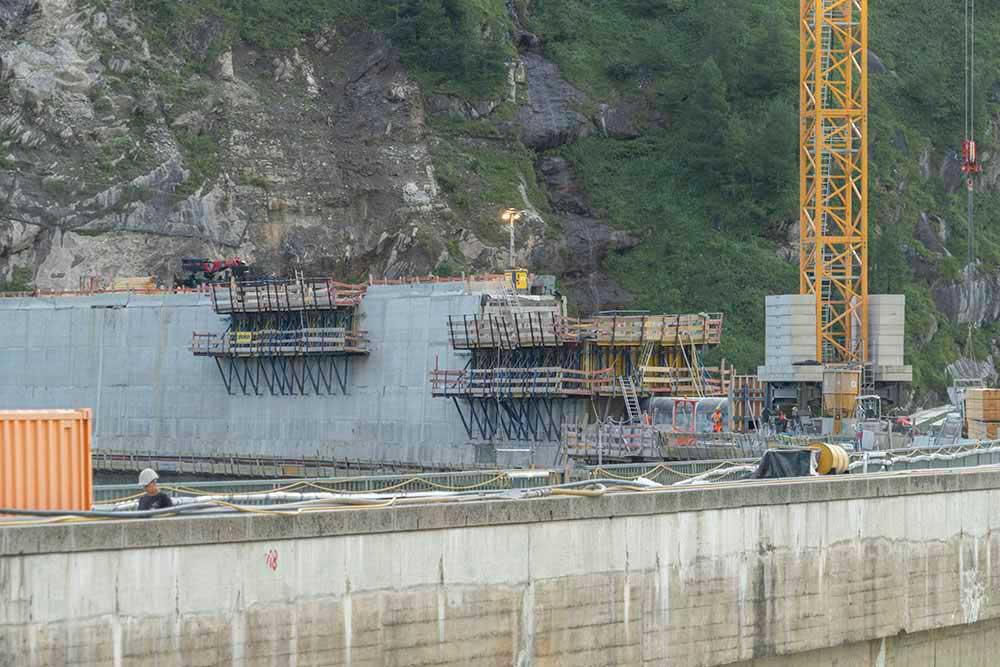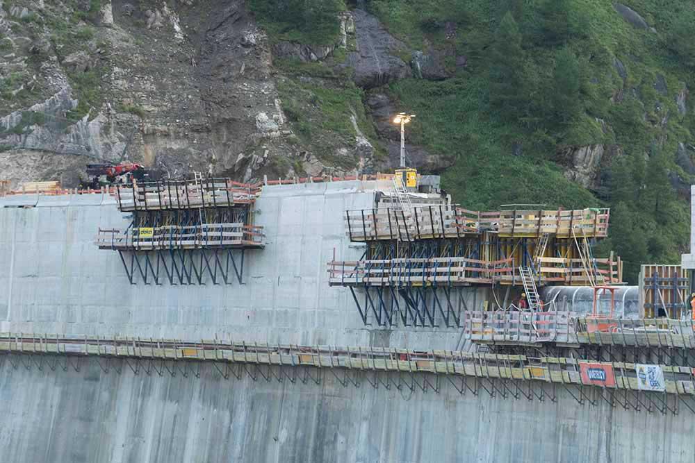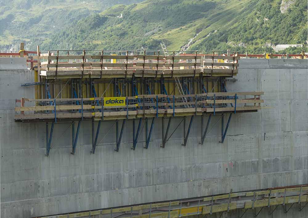 Für die aufwändige Staumauererhöhung kommen 66 Einheiten der Sperrenschalung D22 zum Einsatz. Dieses kranversetzte Kletterschalungssystem ermöglicht präzise und sichere Betonierarbeiten selbst unter extremen Bedingungen. Die Faltbühne K sorgt mit 700 Laufmetern für verlässlichen Zugang und optimale Arbeitsbedingungen an der Staumauer. Auch das Ringlock-Modulgerüst trägt wesentlich zum Baufortschritt bei – sowohl als Treppenturm wie auch als flexible Arbeitsplattform. Ergänzend unterstützt die Trägerschalung Top50 vielseitige Schalungsaufgaben zuverlässig.
