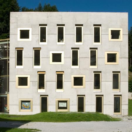 Die Neubauten für Schule und Internat sind in Sichtbeton ausgeführt. Durch die Lochfassade fügen sich die neuen Gebäudeteile harmonisch in die Gesamtanlage ein. Die Innenräume der Schule sind farblich in Weiß und Beton gehalten.
