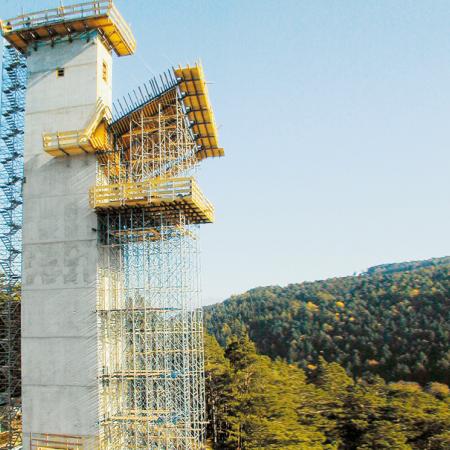 Besondere Ansprüche an die Bauausführenden stellte die 7 m auskragende und mit ihren 23° bzw. 26° doppelt geneigte Betonplatte. Zur Unterstellung wurden ca. 30 m hohe Doka-Traggerüste Staxo mit 42 Rahmenstielen genutzt.