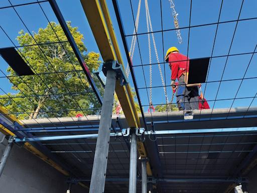 Sofern ausschließlich von oben eingeschalt oder gearbeitet werden kann, schreibt die DGUV Regel geeignete Absturzsicherungen oder Auffangeinrichtungen vor. Ein stabiles Schutzgitter aus Stahl bietet hier eine besonders verlässliche Barriere: Es fängt nicht nur Bewegungsenergie direkt ab, sondern es verhindert den Absturz bereits präventiv. Ein weiterer Vorteil ist der sichere Auf- und Abbau aus dem Stand: Gitter von unten einhängen, nach oben schwenken – fertig. Neben der einfachen Handhabung zeichnet sich das System durch einen geringen Wartungsaufwand und eine unkomplizierte Lagerung aus, beispielsweise da die witterungsbeständigen Komponenten im Freien gelagert werden können. „Unser Ziel war es, eine Lösung zu schaffen, die es dem Kunden sowohl in der Bedienung als auch Lagerung und Wartung so einfach wie möglich macht, und ihm gleichzeitig ein Maximum an Sicherheit bietet“, so Philipp Eberlein, Produktmanager bei Doka Deutschland. „Darum haben wir diese leichte, aber robuste Stahlgitterlösung entwickelt.“