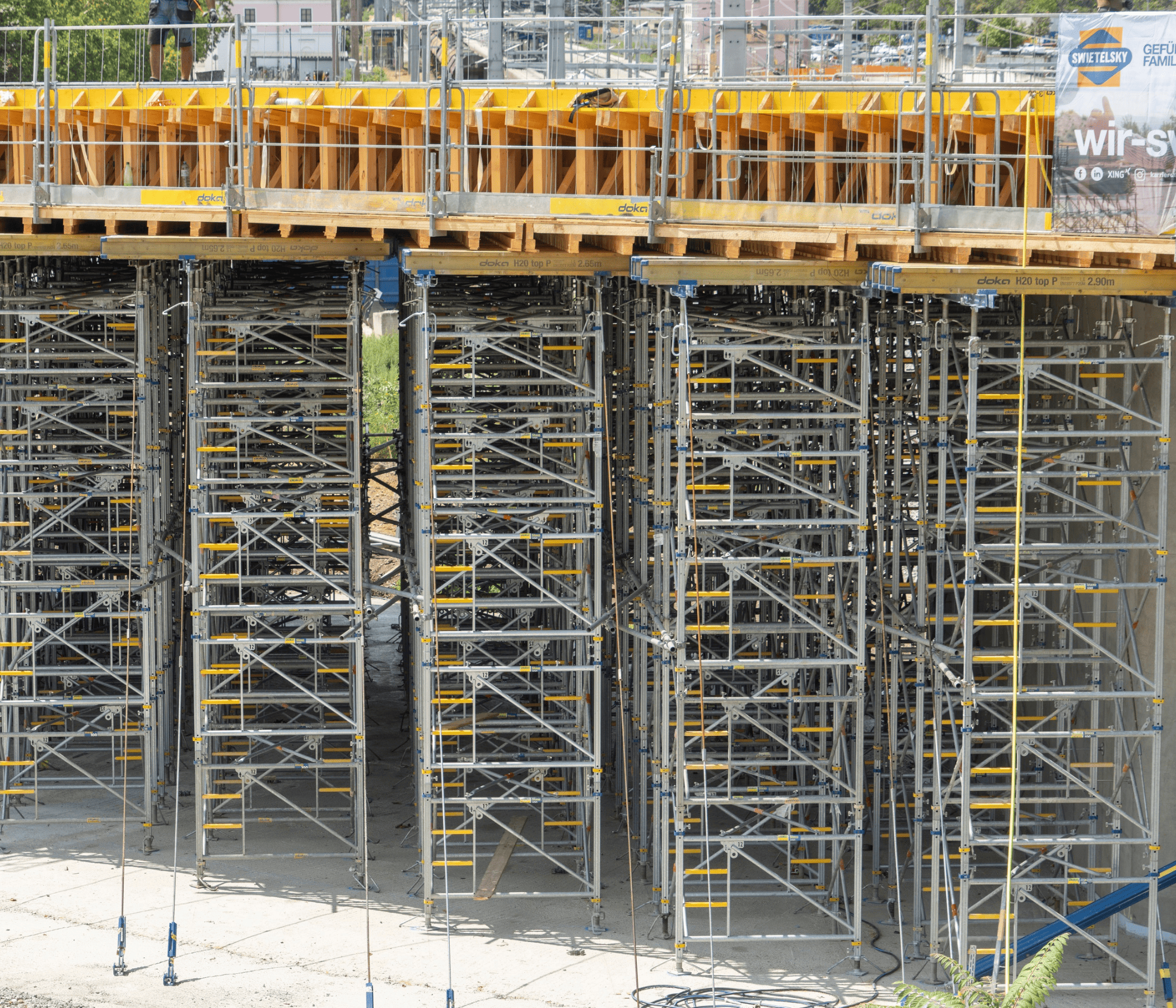 Doka sorgte mit ihrem umfangreichen Produktsortiment für die zuverlässige und clevere Unterstellung des massiven neuen Tragwerks mit einer Länge von 83 m und einer Breite von 15 m. Die Tragwerkstärke variierte von 1,25m im Regelbereich bis zu 1,75 m an den Pfeilern. In den Widerlagerzonen war als Unterstellung das Traggerüst Staxo 100 mit seinen robusten Stahlrahmen im Einsatz.