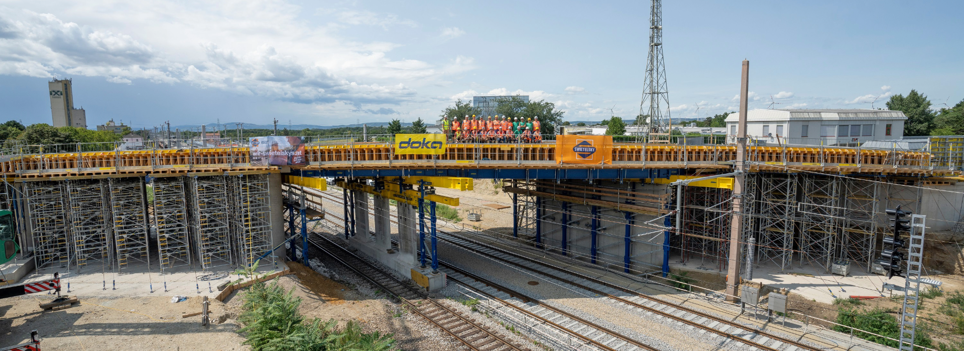 Eine besondere Herausforderung bei diesem Bauvorhaben stellte die Einhaltung des Lichtraumprofils dar, das für den ungehinderten Zugverkehr freigehalten werden musste. Denn außerhalb der kurzzeitigen nächtlichen Sperren wurden die Gleise auch während der Bauphase befahren. Statt eine kostspielige, massive Stahlbau-Sonderanfertigung für die Unterstellung der Gleisbereiche zu beauftragen, konzipierte Doka eine leistungsstarke Unterstellung aus dem mietbaren Baukasten-System Doka UniKit. Ein bestehender Pfeiler der alten Brücke wurde dafür abgeschnitten und als Hilfspfeiler genutzt. Da das Aufrüsten den Mittelpfeilers aufgrund der Gleissperren sehr zeitkritisch war, bereitete sich die Baustellenmannschaft mit einer von Doka aufbereiteten Animation der „digitalen Vormontage“ auf diese Arbeiten vor.