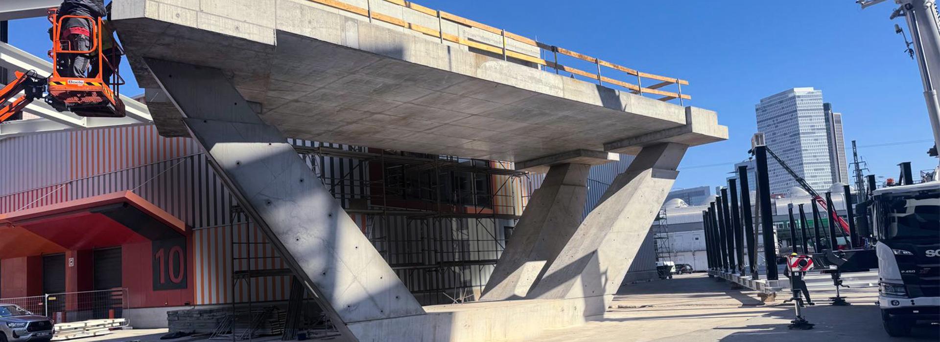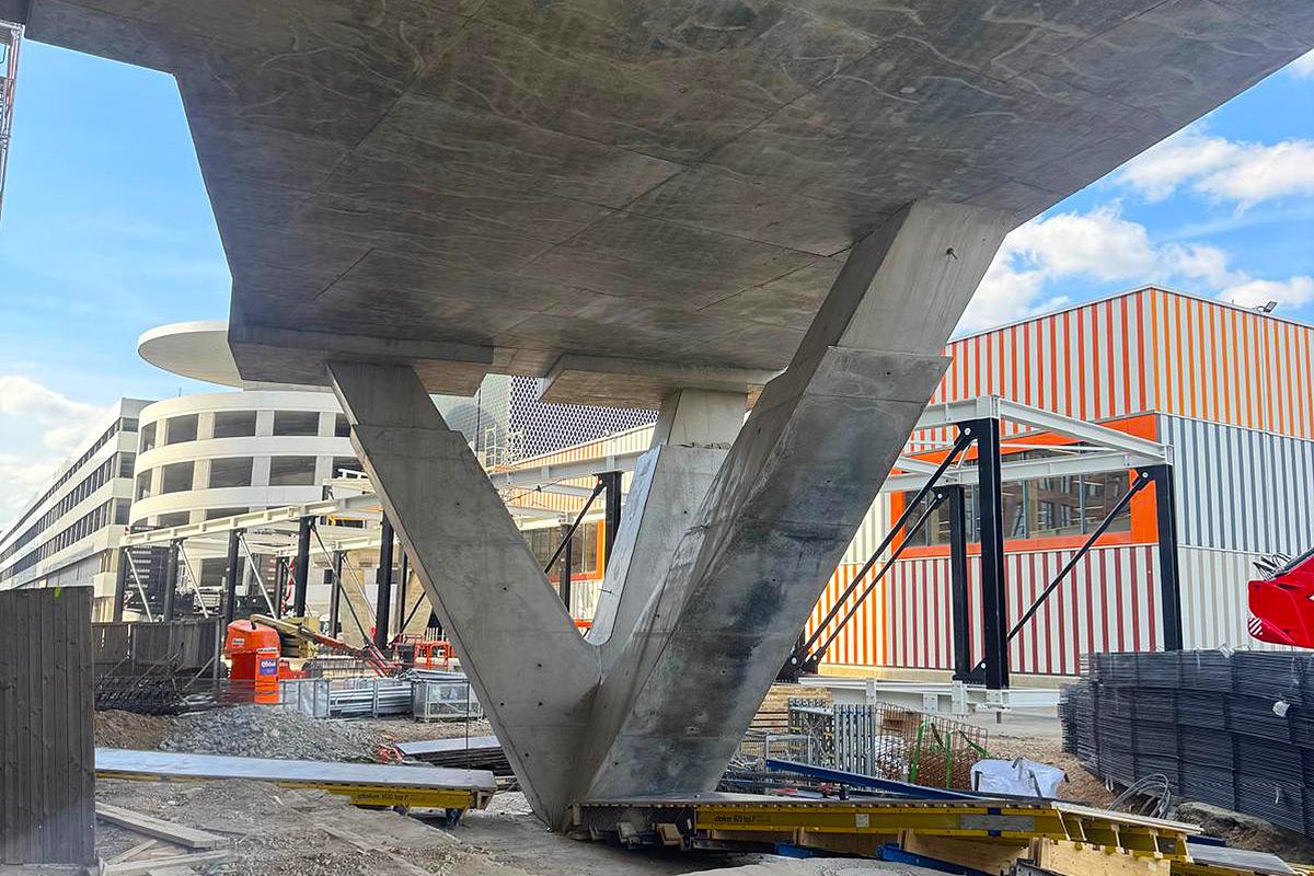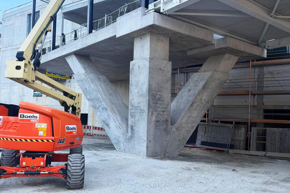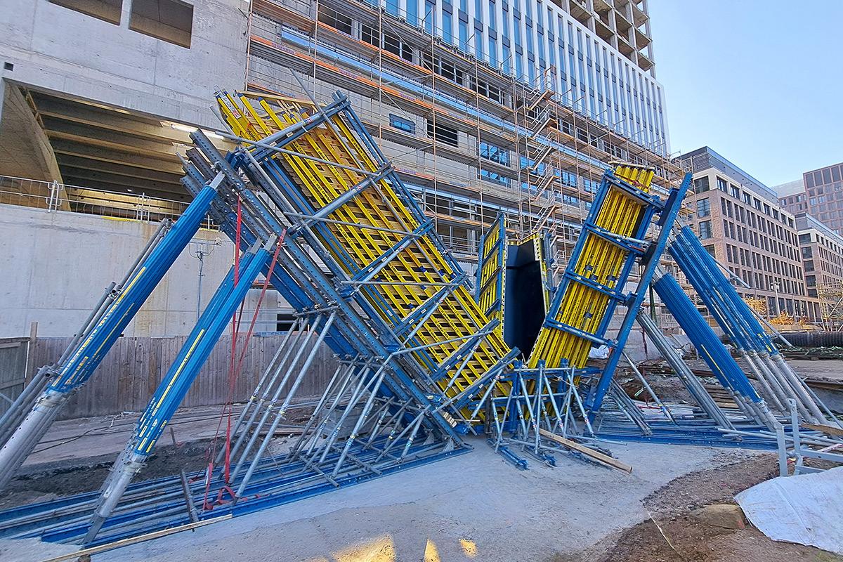 Verantwortlich für das Bauvorhaben ist die Adolf Lupp GmbH & Co. KG, die auch den nahe gelegenen Europa-Allee Tower realisiert. Doch während es beim "EAT" senkrecht in die Höhe geht, geht es bei Via Mobile schalungstechnisch in Schräglage. Im Mittelpunkt des Projekts stehen imposante, geneigte drei- und vierarmige 3D-Stützen, die das Bild des neuen Eingangsbereichs prägen sollen. Ihre besondere Geometrie stellt hohe Anforderungen an Planung und Ausführung. Besonders die dreiarmige Ausführung war dabei technisch anspruchsvoll, da sie mit unterschiedlichen Neigungen und exakt definierten Anschlussflächen ausgeführt werden musste. Mit ihren enormen Dimensionen und den strengen Vorgaben an Maßhaltigkeit sowie an die Betonoberfläche in Sichtbetonklasse SB4 erforderte die Umsetzung höchste Präzision. Auch winterliche Bedingungen und ein enger Zeitplan wirkten sich auf die Abläufe auf der Baustelle aus und verlangten eine vorausschauende Materiallogistik.