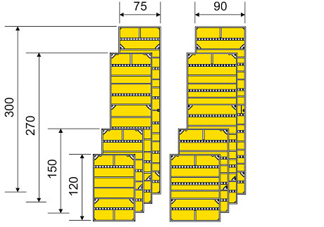 Frami Xlife universal panels are available in widths of 75 cm and 90 cm and in panel heights of 120 cm, 150 cm, 270 cm and 300 cm, for column cross-sections of up to 80 cm x 80 cm, in a 5 cm grid.