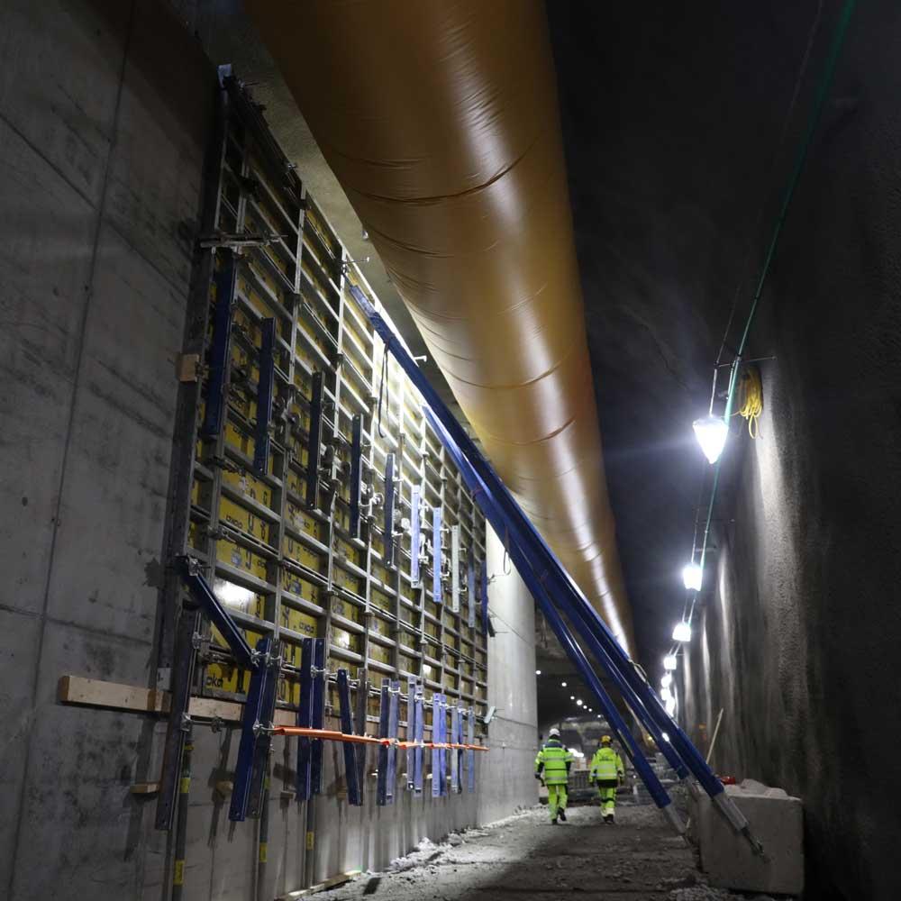 Using Doka UniKit primary and secondary beams, the system could be assembled horizontally outside the tunnel before the 80-tonne SL-1 traveller was positioned at the desired angle and lowered with support from Skanska Stålteknik – providing a stable and robust solution throughout the process.