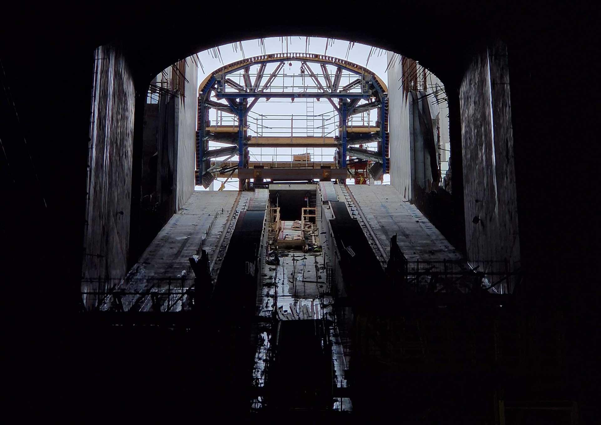 The two-part assembly and concreting sequence allowed the first section to be used for the initial 3.6 m pour while the second section was assembled in parallel. Once connected, the SL-1 tunnel traveller enabled the completion of the remaining section.