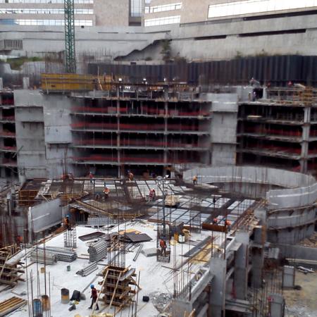 Complex consisting of three towers The building includes four business units: Common offices, a Business Class Hotel, apartments and commercial areas. The overall built-up area will amount to 135,000 m² including 7 underground and twenty above-ground storeys per tower.