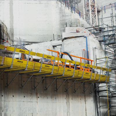 Doka safety systems facilitate every single stage of the project. Safety is 'planned in' right from the outset, co-ordinated with the formwork technology systems used, and designed to boost productivity and quality. The working platforms used in pouring include side railings and opposing guard-rails. On tall wall formwork units, intermediate platforms with side railings are a safe and efficient solution. Safe vertical access to the pouring-platform level is particularly important on column formwork. Doka meets these requirements with practical safety solutions.