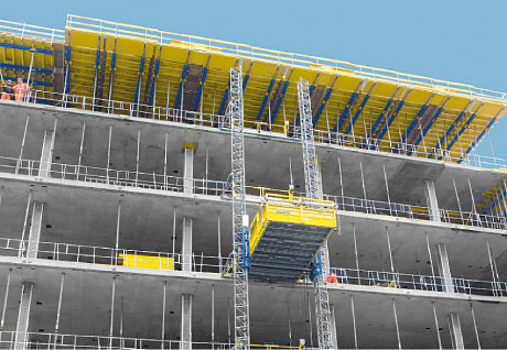 Fast construction workflows without the crane: with the Table Lifting System TLS, tableforms are brought up to the next floor at the push of a button.