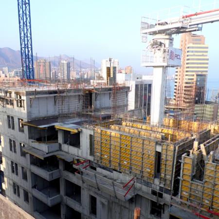 Edificio comercial con el desafio del hormigón armado, alturas de 3.2m entre pisos y hall de acceso de gran altura.