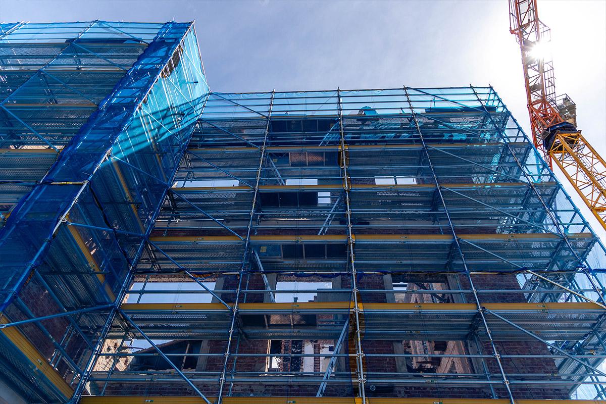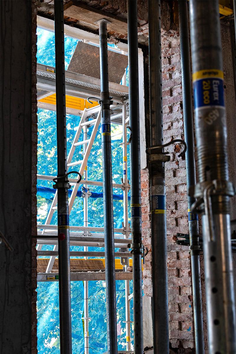 Rusztowanie modułowe Ringlock stanowi wzmocnienie ścian budynku głównego, które składa się z 2 niezależnych systemów konstrukcji. Pierwszą z nich stanowią podwójne dźwigary kratowe o wysokości 50cm ułożone w 4 poziomach między narożami budynku, kotwione do istniejących ścian. Zapewniają one przeniesienie sił poziomych od wiatru przy założeniu niezmienności statycznej i geometrycznej naroży budynku. Druga to rusztowanie elewacyjne o 7 poziomach roboczych. Rusztowanie to gwarantuje przestrzeń roboczą podczas wykonywania prac związanych z pracami konserwatorskimi i renowacją elewacji, jak również zapewnia bezpieczny dostęp do dźwigarów kratowych stanowiących wzmocnienie ścian.