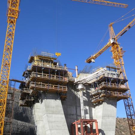 Snedkabelbrons 200 m höga pelare över floden Bouregreg i Marocco har uppförts med de mångsidiga självklättrande plattformarna SKE100 från Doka och Doka-form för stora ytor Top 50.