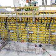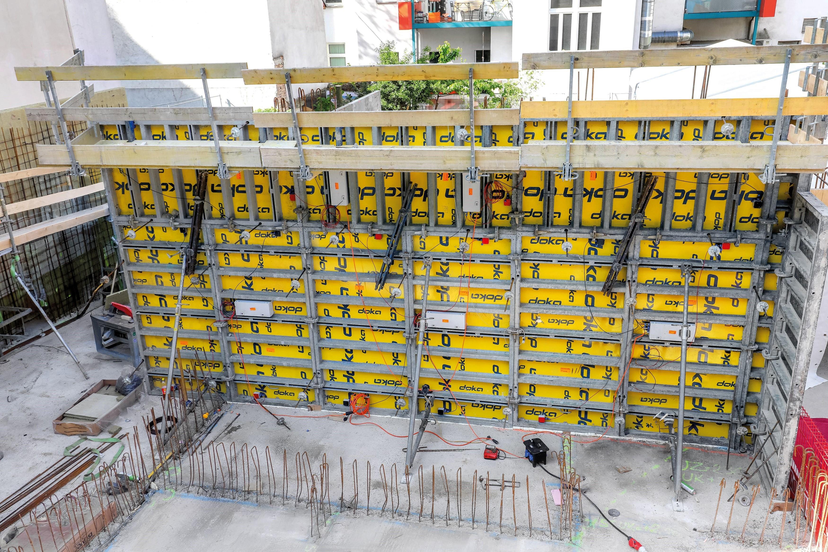 One of the first real-world applications of Intelligent Heated Formwork (IHF) took place at the SOLEY housing development in Vienna’s 20th district. Developed by STRABAG Real Estate, the project combined RCC2-certified low-carbon concrete with IHF for wall construction. Doka’s Concremote sensors were used to monitor concrete compression strength in real time. The pilot confirmed the feasibility of accelerating curing while maintaining construction efficiency and quality.