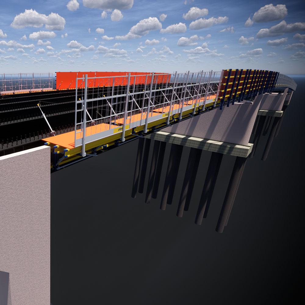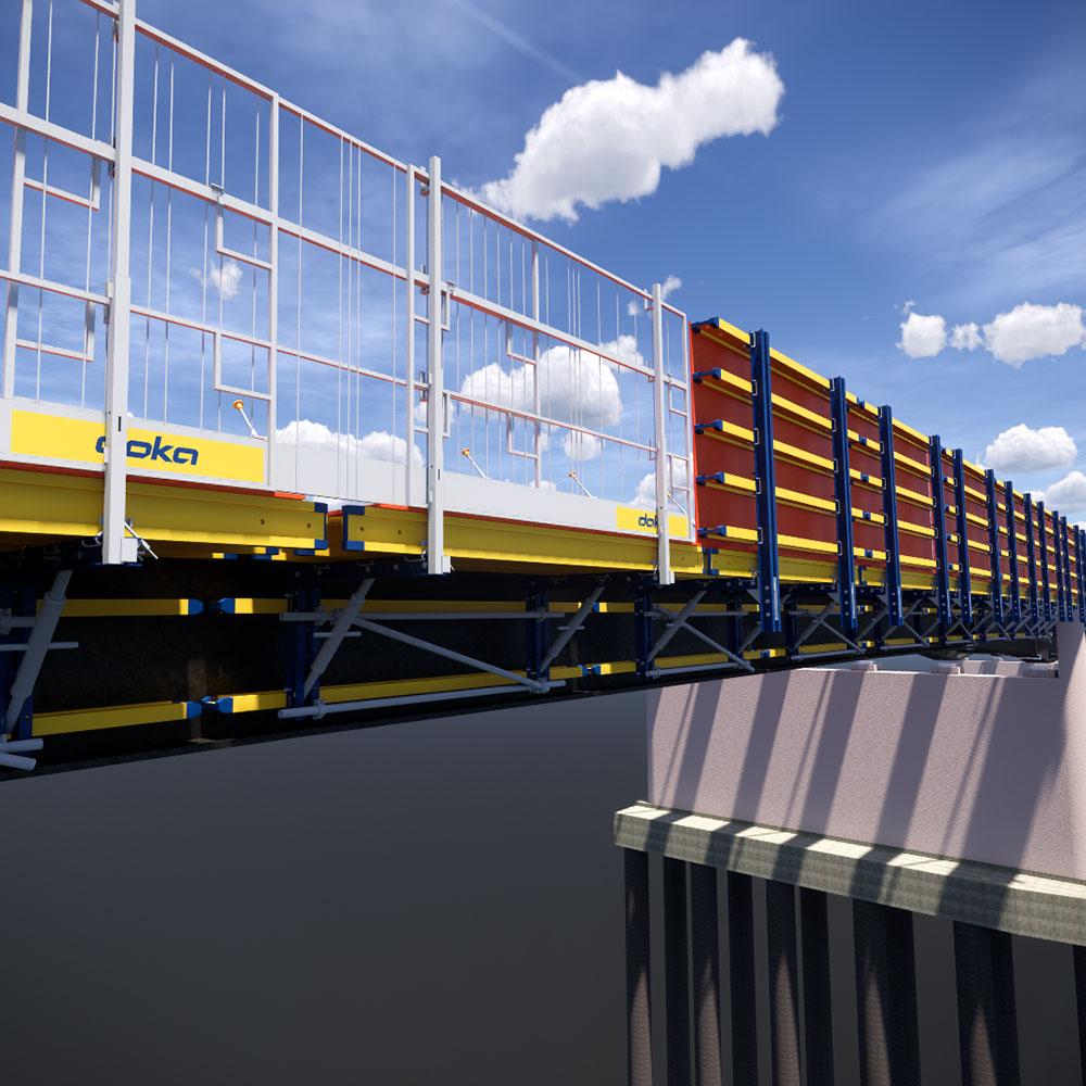 Virtual Model Increases Productivity The formwork experts at Doka supplied a bespoke BIM solution for all the decks, which also included 3D visualisation of the ParaTop system and took into consideration the high safety requirements and project transfer via Projectwise. Doka created a virtual BIM model for the construction of the pile caps, abutments, piers and the bridge support so that wall formwork and cycle times could be planned precisely. This reduced the on-site work and re-focussed resources required by BAM to enable increased productivity.