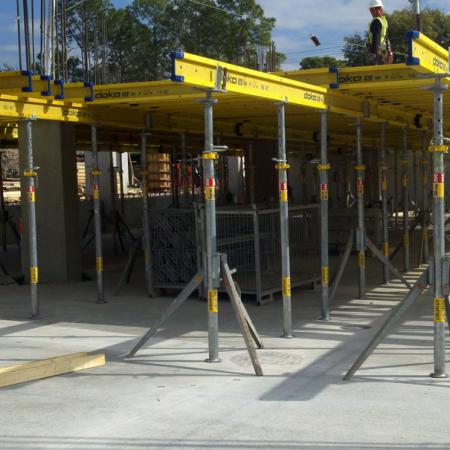 The residential condo community with a bi-level parking garage surrounded on the perimeter by new condo units with a swimming pool located in the middle was constructed using the fast, versatile floor-slab formwork Dokaflex.