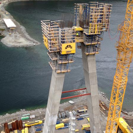 The northernmost bridge pylon ever to be formed by Doka is being erected on the Kåfjord in Norway. A custom high-performing Doka formwork solution using SKE50 automatic climbers is keeping work moving ahead swiftly and safely.